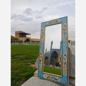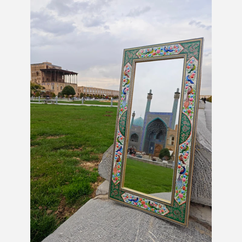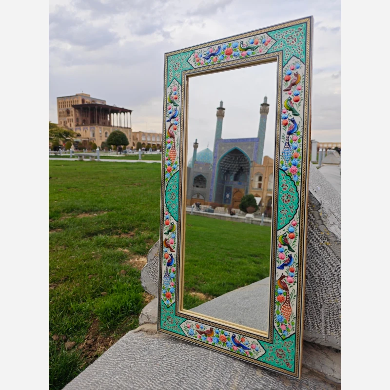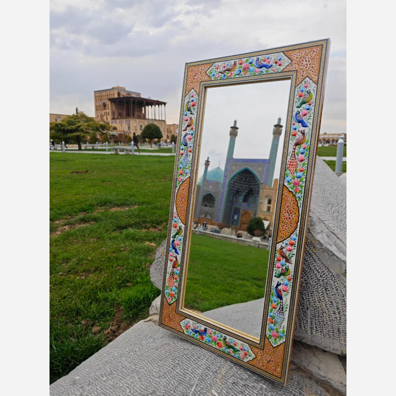 آینه مینیاتور برجسته گل ومرغ تماما کاردست دارای دو حاشیه خاتمکاری دارای پوشش پلی استر جهت دوام درمناطق رطوبت بالا رنگ ثابت