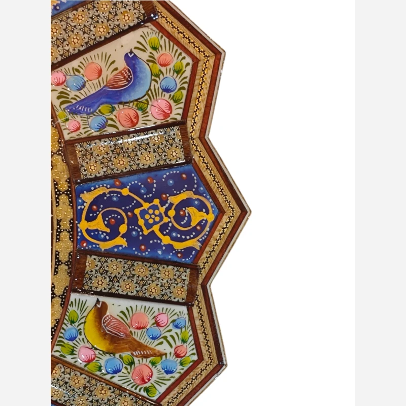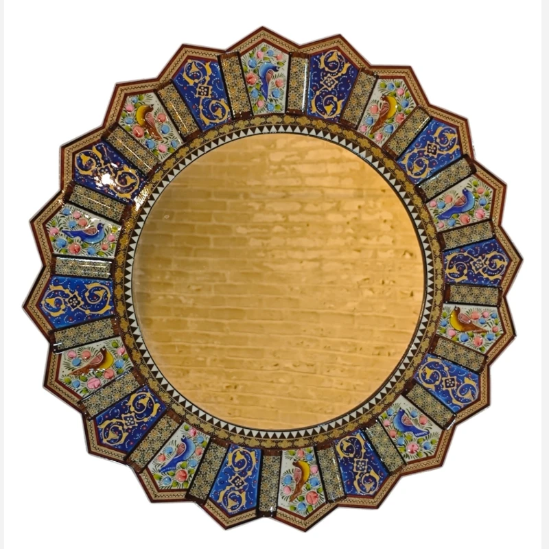 آینه خورشیدی خاتمکاری شده با سیم برنج و استخوان شتر و مینیاتور برجسته گل و مرغ ابعاد کل آینه 57*57 دارای پوشش عالی پلی استر جهت دوام در مناطق رطوبت بالا
