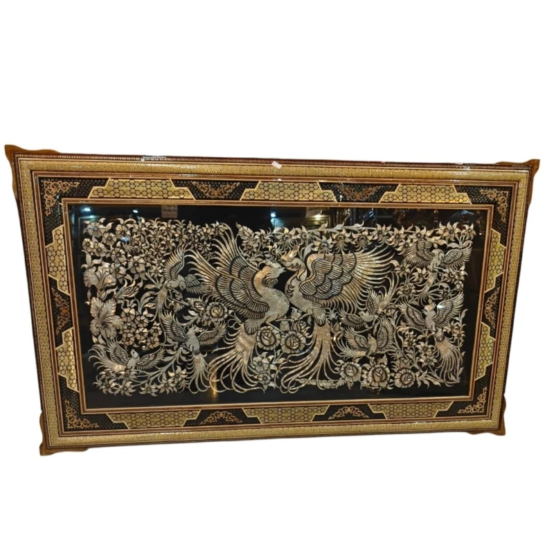 تابلو قلمزنی قاب تمام خاتم اعلا ابعاد کل 120*70 ابعاد شیشه خور داخل قاب 100*50 بدون تغییر رنگ قاب دارای پوشش پلی استر جنس ورقه قلمزنی مس سفید شده با قلع جنس قاب چوب خاتم کاری شده ( سیم برنج و استخوان شتر)