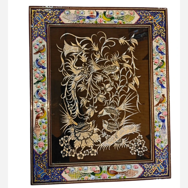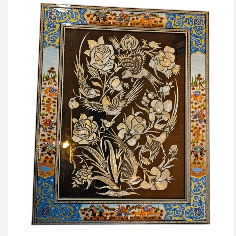 تابلو قلمزنی در سایز کل 50 در 40 مینیاتور گل ومرغ و شکارگاه و اسلیمی در طرح های مختلف دارای دو حاشیه خاتمکاری پلی استر درجه یک جهت دوام در مناطق رطوبت بالا