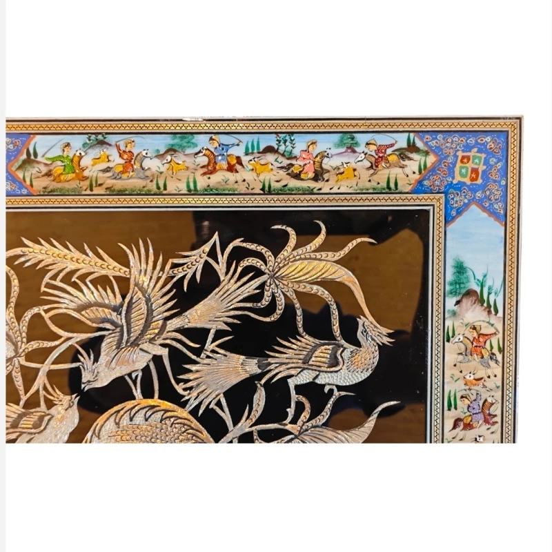 تابلو سه هنر خاتم کاری و قلمزنی روی فلز مس سفید شده با قلع و مینیاتور برجسته شکارگاه دارای روکش عالی پلی استر پشت و روی قاب جهت دوام در مناطق رطوبت بالا رنگ ثابت کیفیت تضمینی