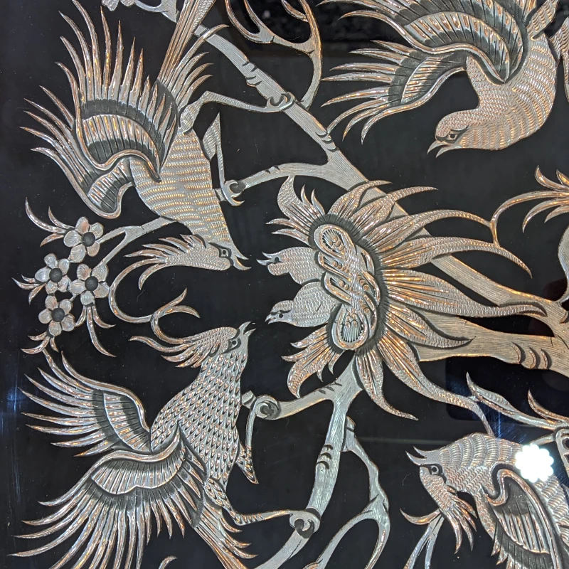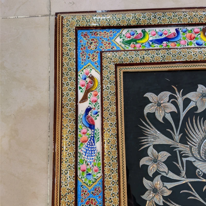 تابلو قلمزنی خاتم+ مینیاتور برجسته گل و مرغ دارای پوشش پلی استر جهت دوام در مناطق رطوبت بالا با ضمانت برگشت.