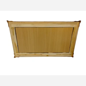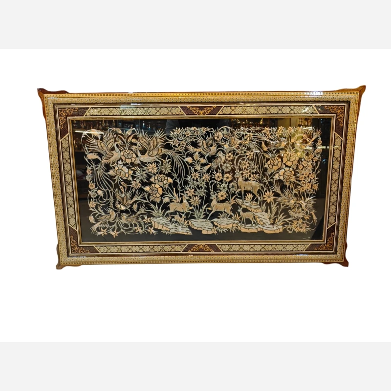 تابلو قلمزنی تمام خاتم جنس ورقه داخل از مس (روکش قلع خورده سفید شده) رنگ ثابت خاتم از سیم برنج و استخوان تشکیل شد دارای پوشش پلی استر جهت دوام در مناطق رطوبت بالا