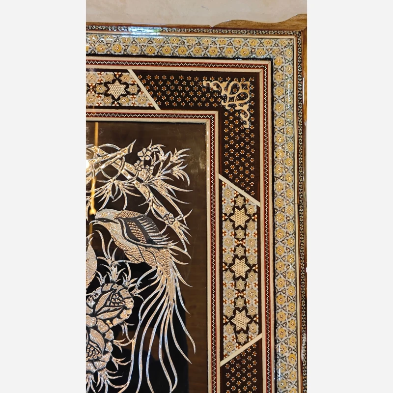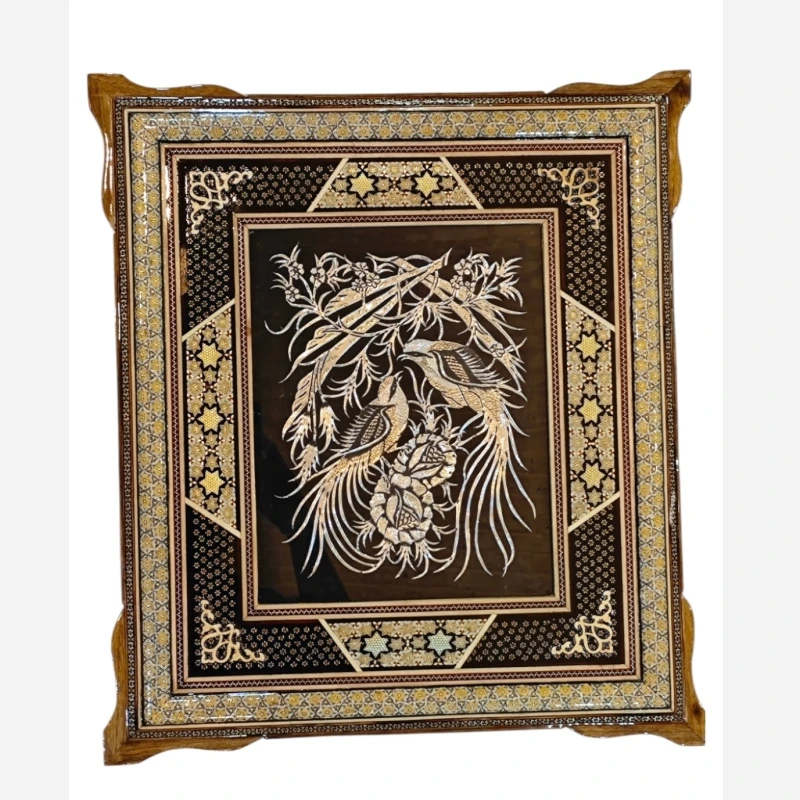 تابلو دو هنر خاتم کاری و قلمزنی روی فلز مس سفید شده با قلع دارای روکش عالی پلی استر پشت و روی قاب جهت دوام در مناطق رطوبت بالا رنگ ثابت کیفیت تضمینی