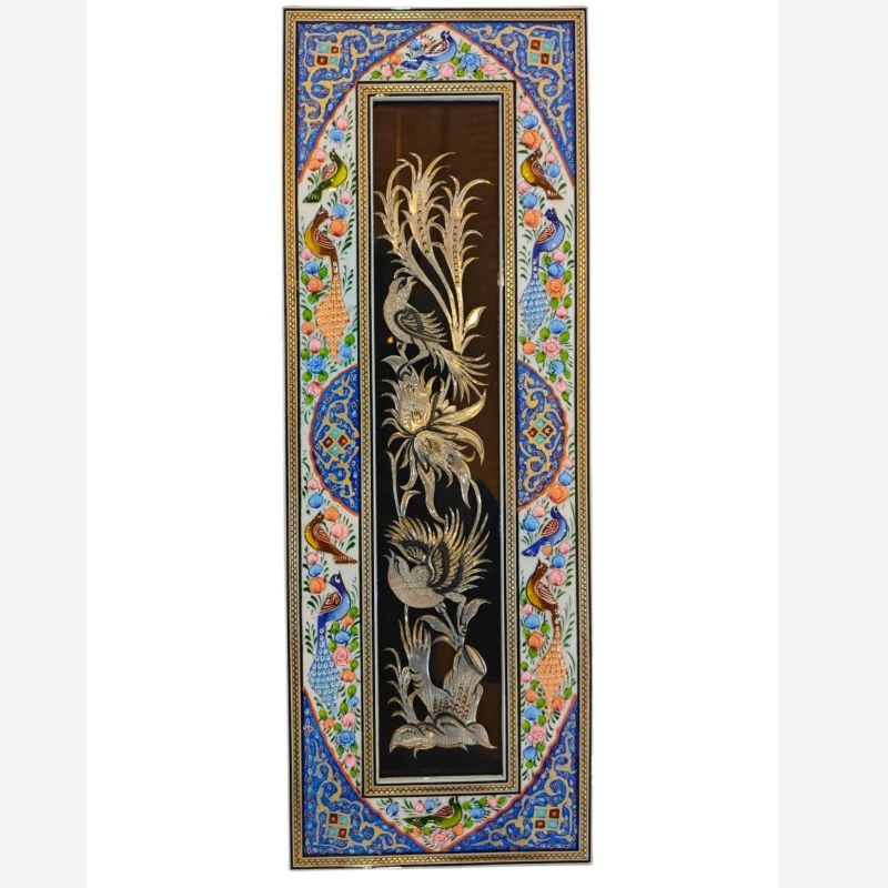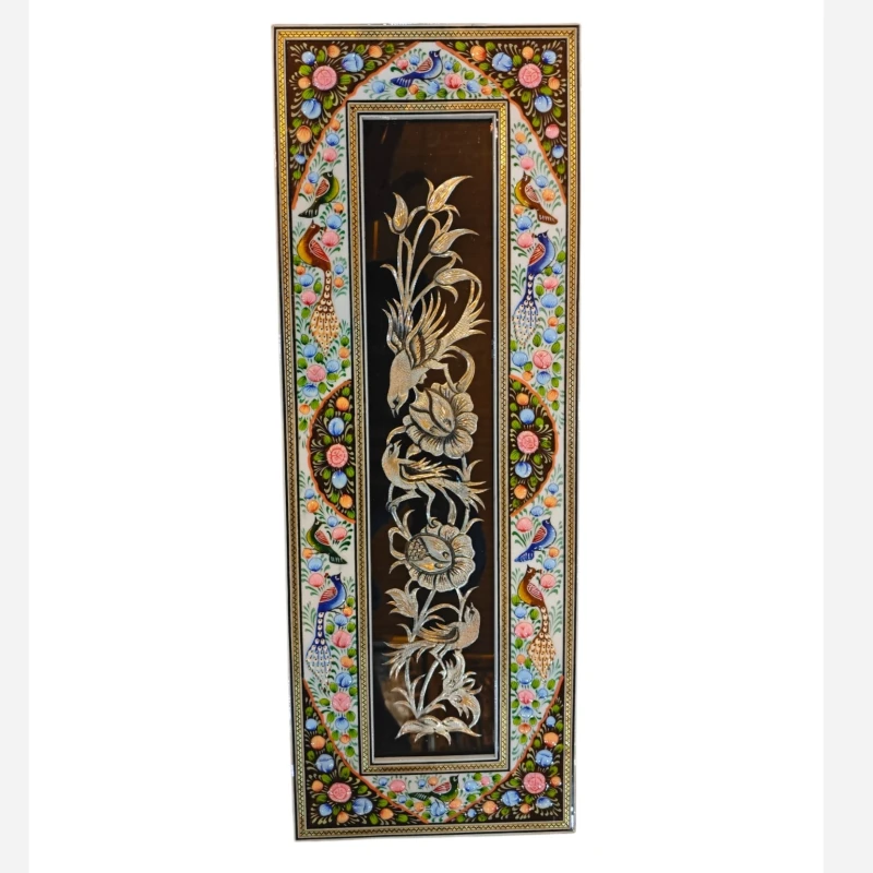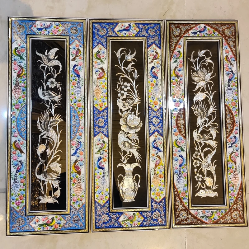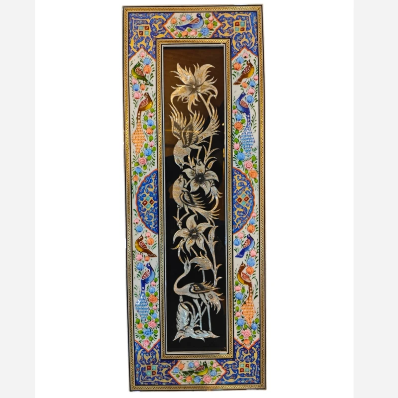تابلو های ستونی در طرح های مختلف کیفیت عالی نقاشی مینیاتور گل و مرغ برجسته دوتا حاشیه خاتم سایز کوچکتر موجود میباشد قلمزنی تماما کار دست جنس ورقه قلمزنی مس میباشد رنگ ثابت بدون تغییر رنگ