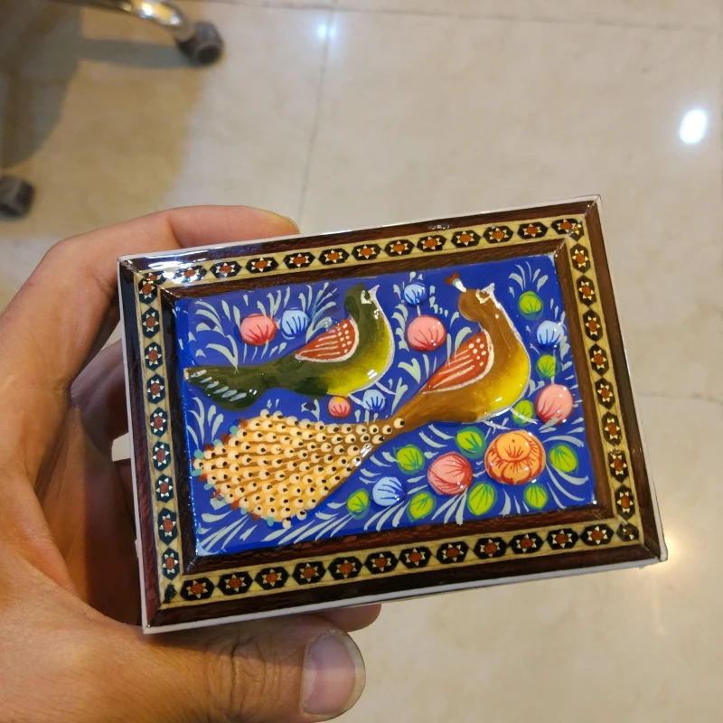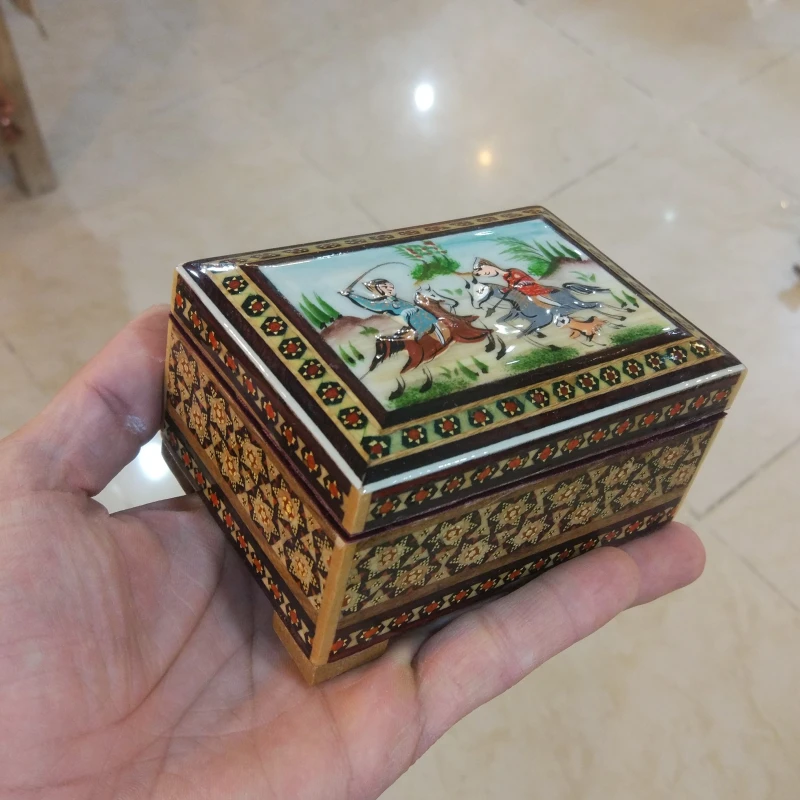 جعبه جواهرات خاتم و نقاشی مینیاتور برجسته گل و مرغ و اسب و شکار با بهترین کیفیت رنگ پلی استر خورده کیفیت خاتم و نقاشی عالی