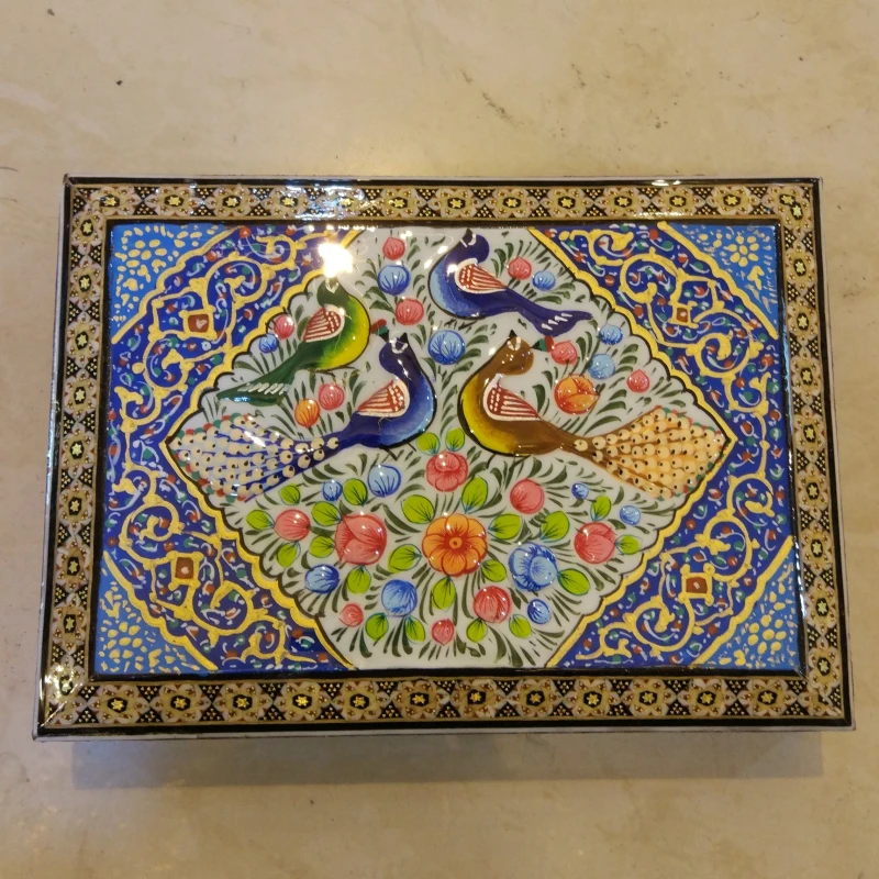 جعبه خاتم نقاشی مینیاتور سایز بزرگ کیفیت نقاشی و رنگ ها شفاف و عالی پلی استر خورده جهت دوام در رطوبت بالا طرح های مختلف از این کار وجود دارد