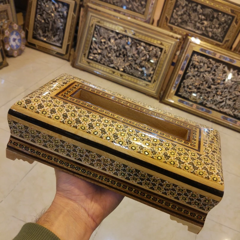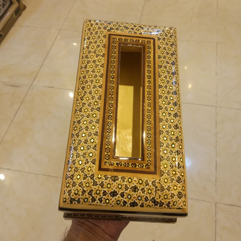 جعبه دستمال تمام خاتم کیفیت خوب پلی استر خورده .درب از زیر کشویی باز میشود.