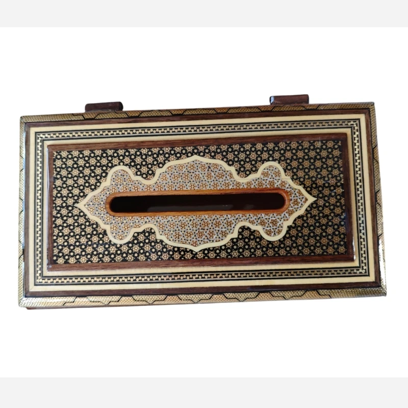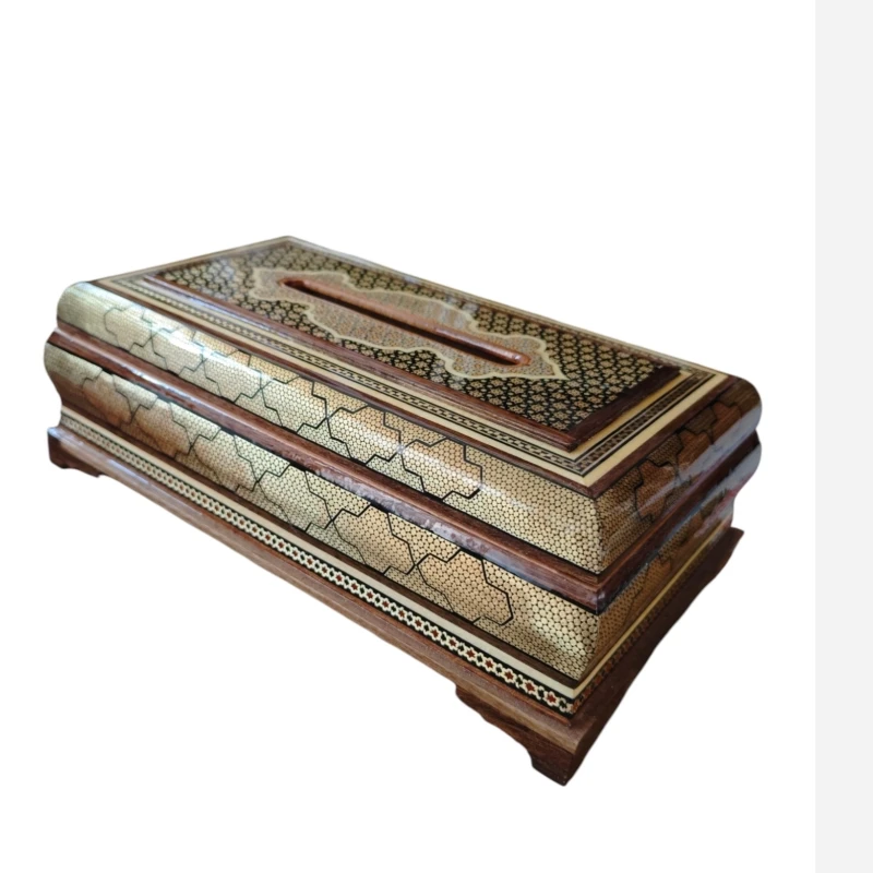جعبه دستمال خاتم صلیبی اعلا بهترین کیفیت جعبه دستمال بازار پر از سیم برنج و استخوان شتر دارای پوشش عالی پلی استر جنس چوب خاتمکاری شده با سیم برنج
