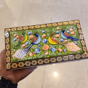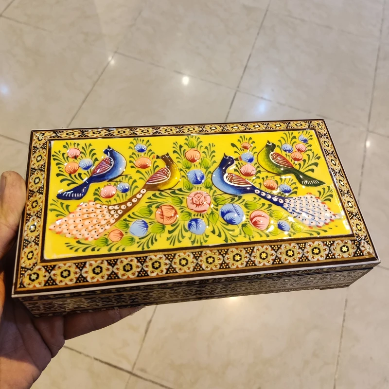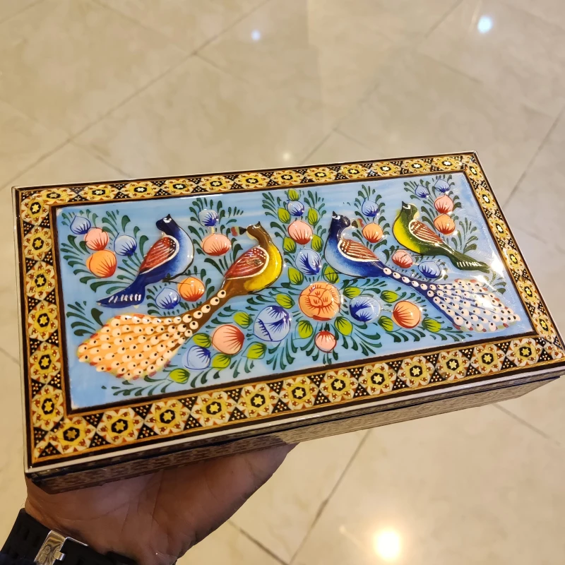 جعبه مینیاتور گل ومرغ برجسته و خاتم کاری شده ..پلی استر خورده جهت دوام در مناطق رطوبت کیفیت عالی نقاشی شده توسط استاد
