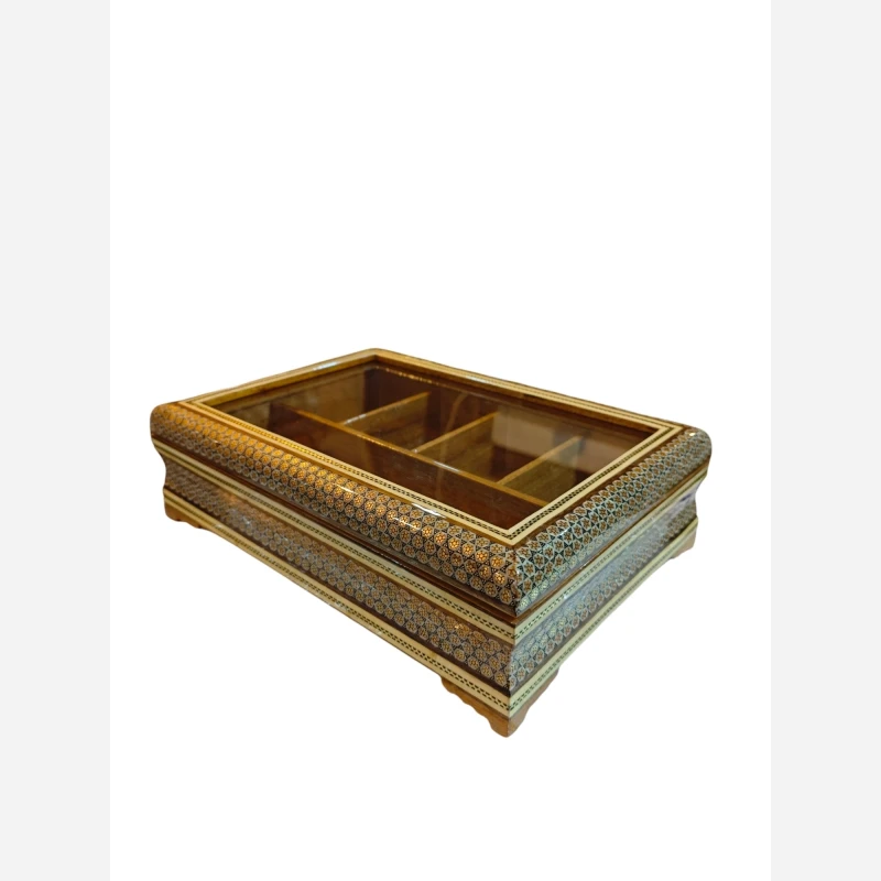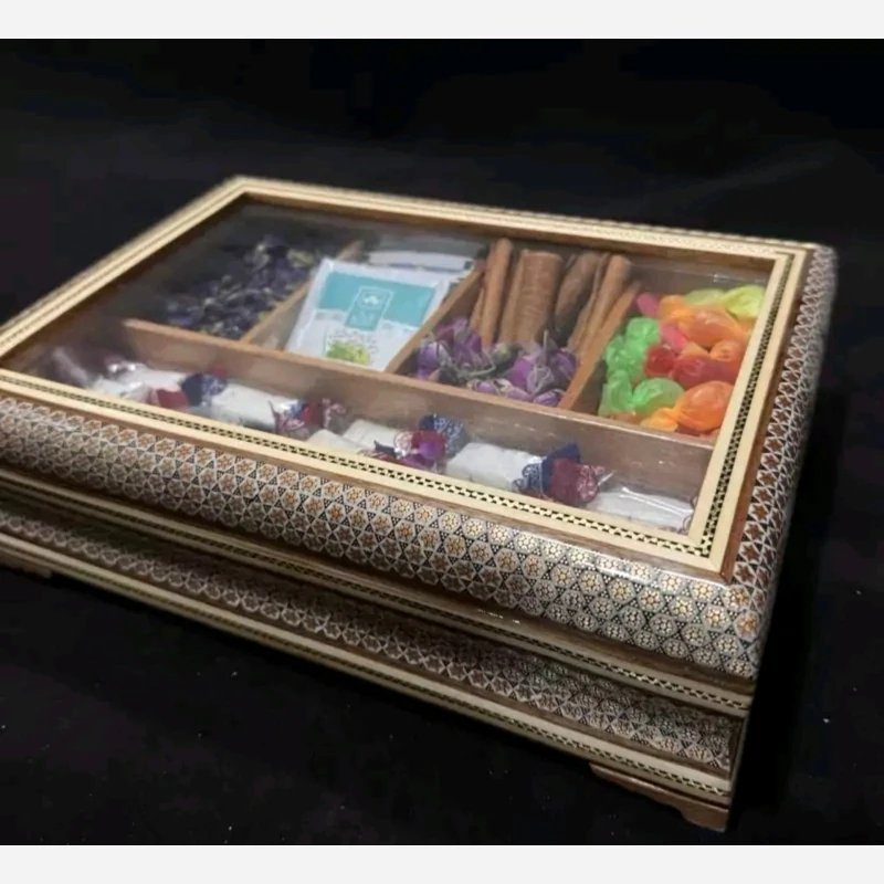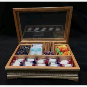 برای انواع دمنوش ، چای کیسه ای و خوراکی های کوچک و رنگی که در کنار نوشیدنی های خوش طعم لحظاتی به یاد ماندنی برای شما و مهمان هایتان رقم میزند و همچنین به عنوان هدیه ای برای عزیزانتان می باشد. کمتر جنس چوب و مس و استخوان شتر و سیم های برنجی رنگ مطابق تصویر جعبه تی بگ و دمنوش خاتم کاری خورشیدی درب شیشه ای محصولی زیبا و چشم نواز در ساخت این محصول از خاتم طرح شیشی و پر سیم و استخوان استفاده شده است. دارای 5 قسمت برای قرار دادن انواع دمنوش ….. با ضمانت اصالت و فیزیکی محصول این جعبه با طول و عرض 32 در 22 سانتی متری و ارتفاع 9 سانتی متر با درب شیشه ای