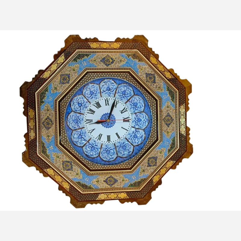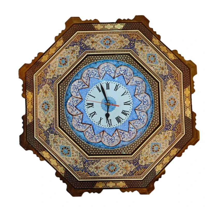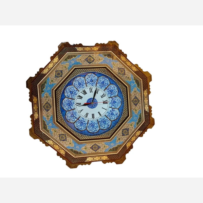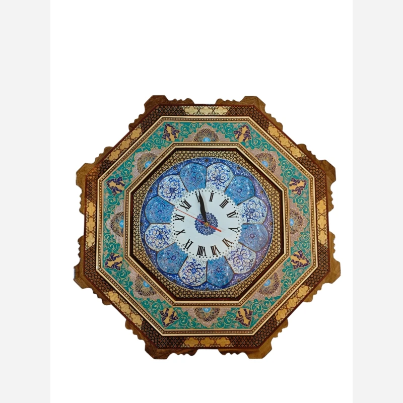ساعت هشت ضلعی ترکیب هنر مینیاتور+میناکاری+خاتم کاری ابعاد:53*53 cm قطر بشقاب ساعت:30 cm جنس بشقاب ساعت مس ( میناکاری) دارای پوشش عالی پلی استر موتور ساعت تایوان