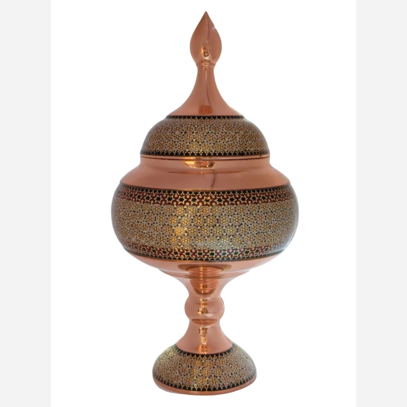 شکلات خوری و گلدان مسی خاتم کاری شده ( سیم برنج و استخوان شتر) رنگ ثابت دارای کارت گارانتی پنج ساله آوا دارای پوشش عالی پلی استر