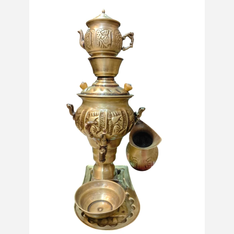 سماور برنجی دکوری پنج تکه شامل قوری ،سینی،پیاله،پارچ،مخزن رنگ ثابت قلمزنی شده