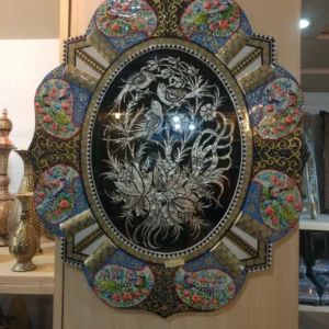 تابلو قلمزنی خاتم و نقاشی مینیاتور گل ومرغ برجسته پلی استر خورده جهت دوام در مناطق با رطوبت زیاد.جنس ورقه داخل مس میباشد با روکش قلع.