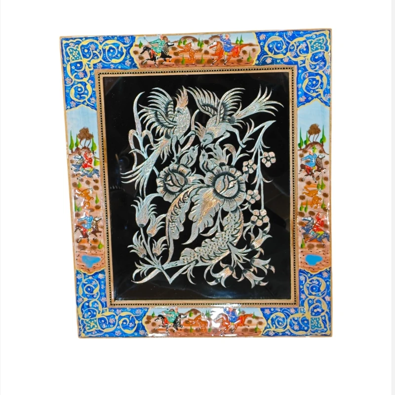 تابلو قلمزنی روی مس سفید شده با قلع در قاب زیبای مینیاتور طرح شکارگاه برجسته قاب دارای روکش پلی استر درجه یک رنگ ثابت
