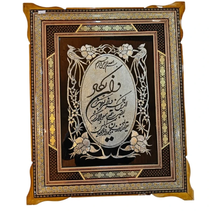 تابلو قلمزنی جنس قلمزنی مس روکش قلع خورده قاب چوبی خاتمکاری شده از سیم برنج قاب دارای پلی استر درجه 1