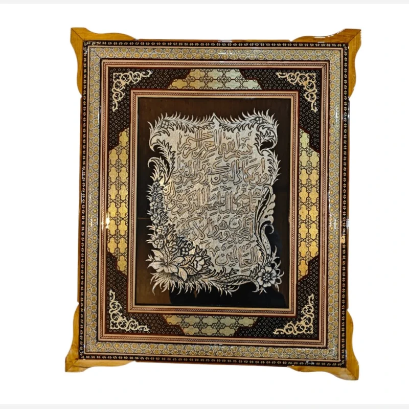 تابلو قلمزنی جنس قلمزنی مس روکش قلع خورده قاب چوبی خاتمکاری شده از سیم برنج قاب دارای پلی استر درجه 1 خط اینه تراش خورده و سیاه قلم